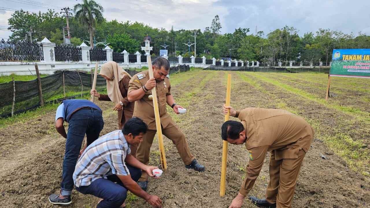 Kali ini, tekad itu dibuktikan dengan penanaman jagung di areal sekitar setengah hektar di halaman Meuligoe Bupati Aceh Besar, Kota Jantho, Senin (02/12/2024) petang tadi. “Ini bentuk langsung dari penegakan upaya ketahanan pangan, dengan memanfaatkan lahan tidur di pekarangan Meuligoe Bupati,” ujar Penjabat (Pj) Bupati Aceh Besar, Muhammad Iswanto SSTP MM, sejenak usai melakukan penanaman perdana jagung manis (sweet corn) di pekarangan Meuligoe Bupati.