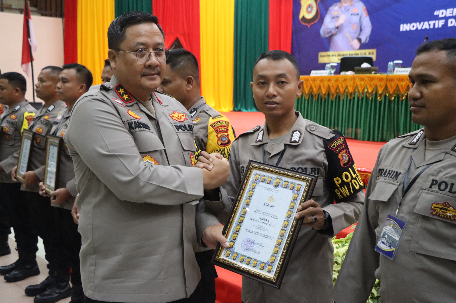 Dalam kegiatan itu juga, Kapolda Aceh bersama Wakapolda, Irwasda, dan Dirbinmas menyerahkan piagam penghargaan kepada lima pemenang lomba kategori Polsek terbaik, lima Bhabinkamtibmas, dan lima polisi RW terbaik di tingkat Polda dan Polres jajaran dalam rangka mendukung 100 hari kinerja Kapolda Aceh. Kapolda juga memberikan hadiah khusus berupa umrah kepada tiga Bhabinkamtibmas terbaik. (*)