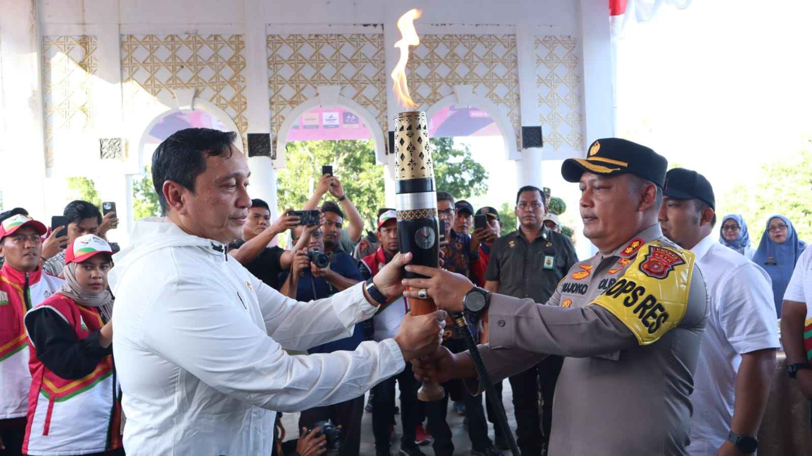 ACEH BESAR – Kapolres Aceh Besar AKBP Sujoko S.I.K.,M.H.,bersama unsur Forkopimda sambut kedatangan Kirab Api PON XXI Aceh-Sumut 2024 di Meuligoe Bupati Aceh Besar,Kamis (05/09/2024)