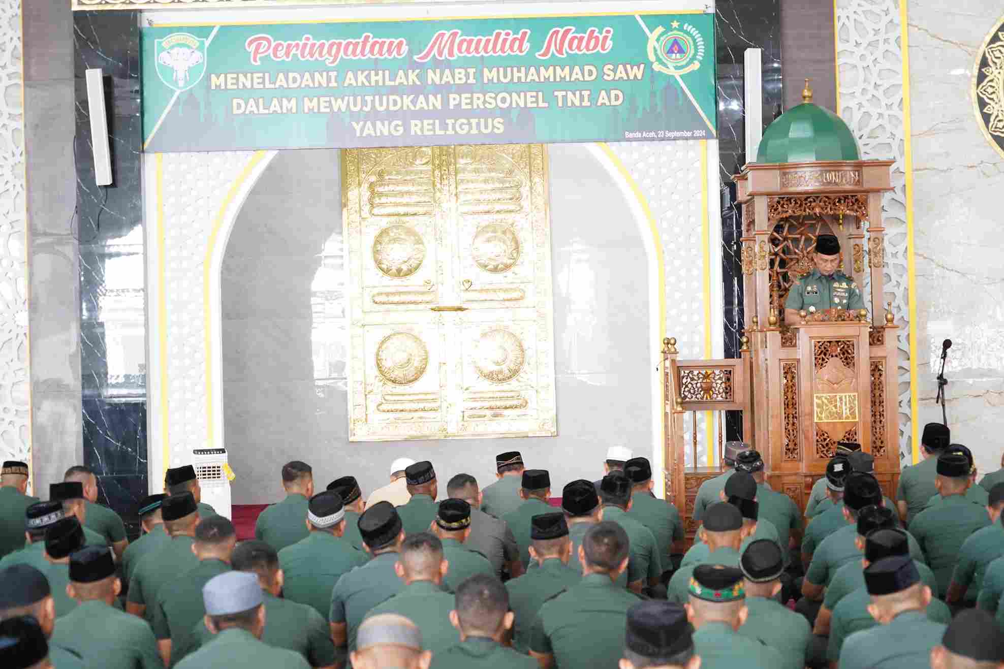 BANDA ACEH – Kepala Staf Komando Daerah Militer Iskandar Muda (Kasdam IM) Brigjen TNI Ayi Supriatna, S.I.P., M.M. mewakili Pangdam IM Menghadiri peringatan Maulid Nabi Besar Muhammad SAW 1446 H/2024 M, bertempat di Masjid Babulmawadda Makodam IM, Banda Aceh. (23/09/24).