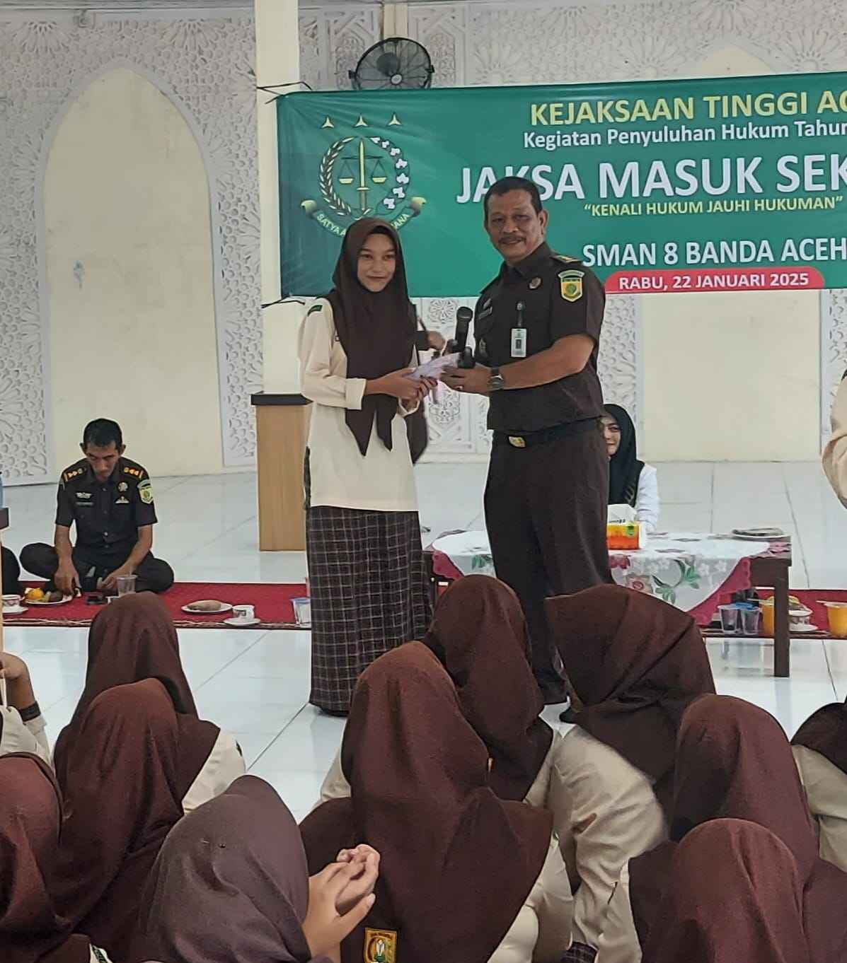 Kehadiran Jaksa Masuk Sekolah di sambut baik oleh SMAN 8 Banda Aceh hal ini tampak antusias siswa menyampaikan pertanyaan terkai masalah hukum, suasana semakin meriah kala Kasi Penkum membagikan hadiah payung kepada siswa yang mengajukan dan menjawab pertanyaan dengan benar.