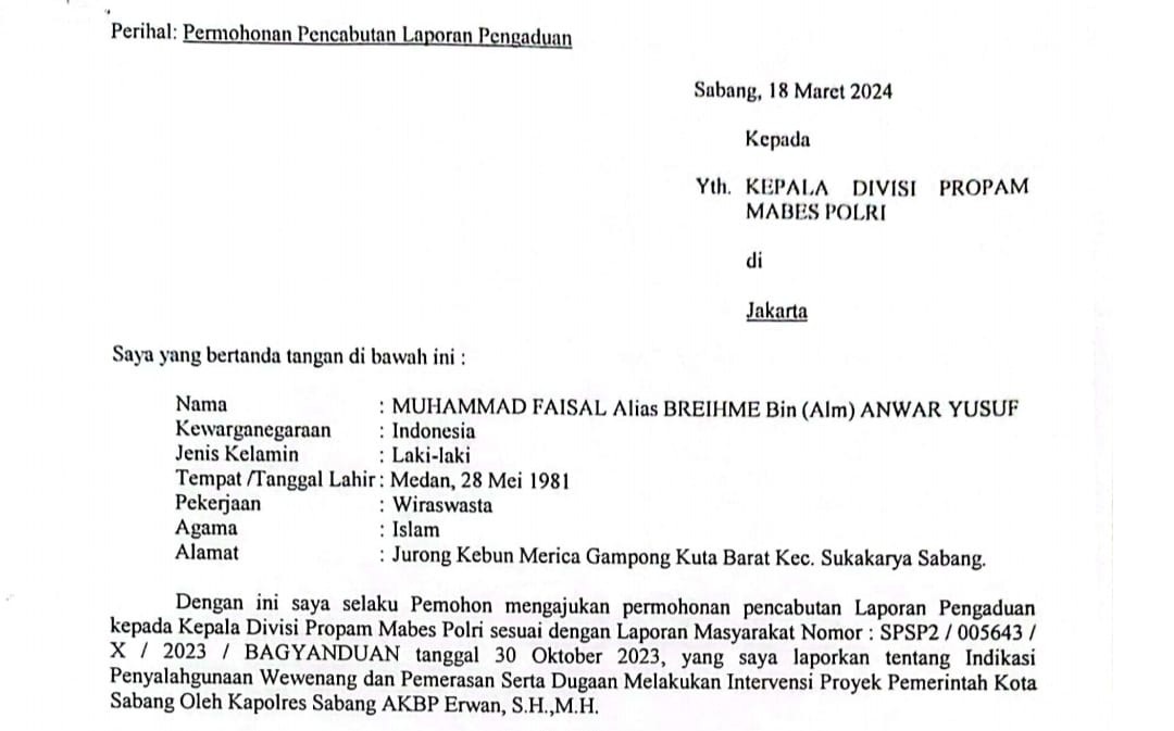 Oleh karena itu, atas kesadaran sendiri Faisal mencabut laporan tersebut. Ia membuat dan mengirimkan surat secara resmi kepada Kepala Divisi Propam Mabes Polri pada tanggal 18 Maret 2024 untuk mencabut laporan terhadap Kapolres Sabang AKBP Erwan, SH., MH. Surat tersebut dibuat dan ditandatangani atas meterai cukup.