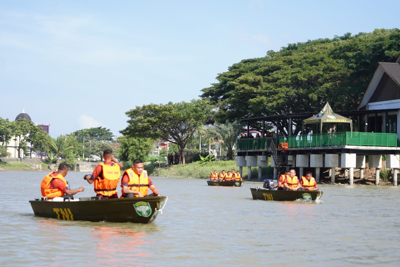 BANDA ACEH – Panglima Komando Daerah Militer Iskandar Muda (Pangdam IM) Mayor Jenderal TNI Novi Helmy Prasetya, S.I.P, M.I.P berserta PJU Kodam IM meninjau pelaksanaan uji fungsi 5 Unit Boat PE 15 PK, di Sungai Krueng Aceh depan Bale Sanggamara Makodam IM, Rabu (31/01/24).