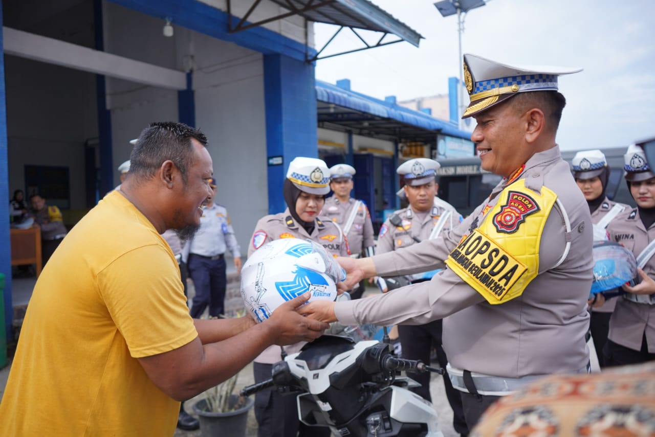 “Helm bukan hanya cantolan saat berkendara, tetapi lebih melindungi kepala kita dari kerasnya aspal. Sayangi nyawa, sayangi keluarga,” ujar Kombes Pol. M. Iqbal Alqudusy kepada para penerima helm.