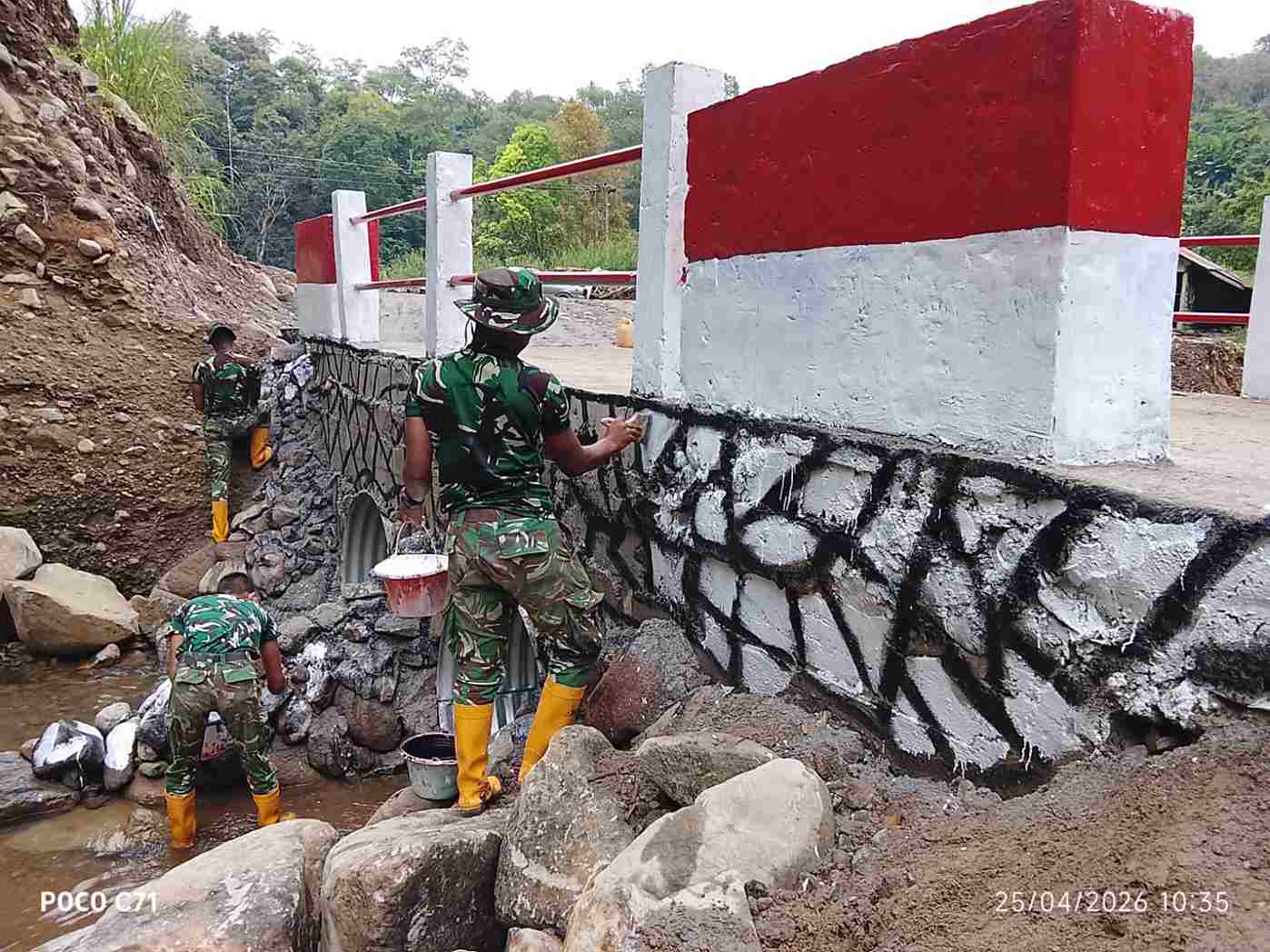 Pada Minggu (26/04/2026), personel TNI dari Koramil 04/Pintu Rime Gayo (PRG) Kodim 0119/Bener Meriah terus mengintensifkan pekerjaan finishing guna memastikan jembatan tersebut segera rampung dan siap difungsikan dalam waktu dekat.