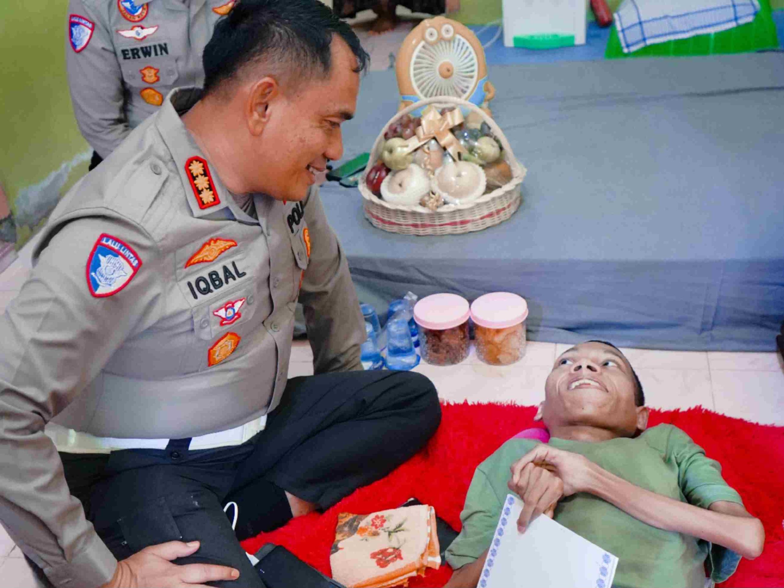 BANDA ACEH – Dirlantas Polda Aceh, Kombes Pol Muhammad Iqbal Alqudusy, bersama personelnya mengunjungi dan memberi santunan untuk penderita lumpuh layu Ramadhan (25), asal Gampong Ulee Barat, Lhoksukon, Aceh Utara, yang menginap di rumah saudaranya di kawasan Jeulingke, Banda Aceh pada Kamis, 8 Mei 2025 sore