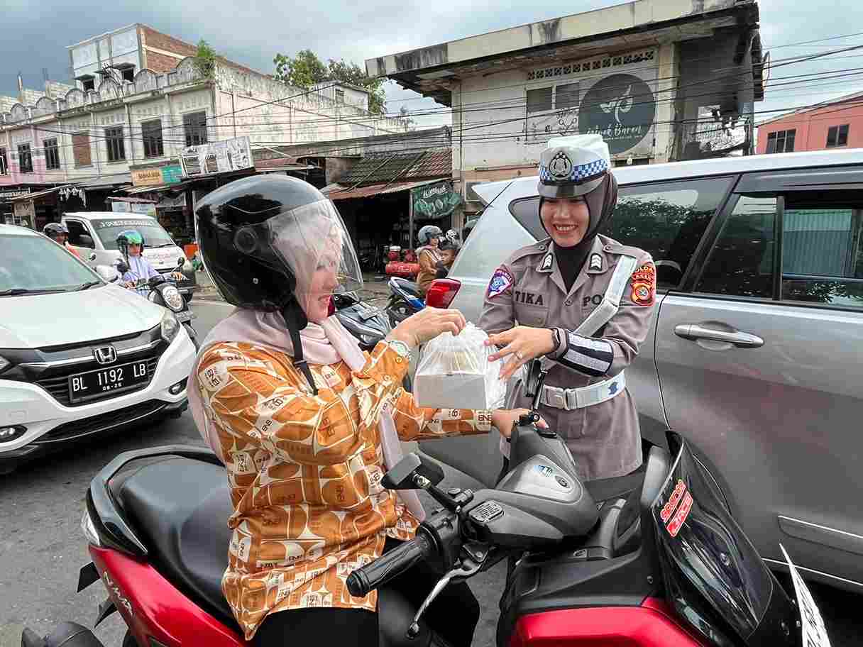 BANDA ACEH – Personel Direktorat Lalu Lintas (Ditlantas) Polda Aceh menggelar aksi sosial dengan membagikan takjil kepada para pengendara yang melintas di sejumlah titik di Kota Banda Aceh, Senin, 10 Maret 2025.