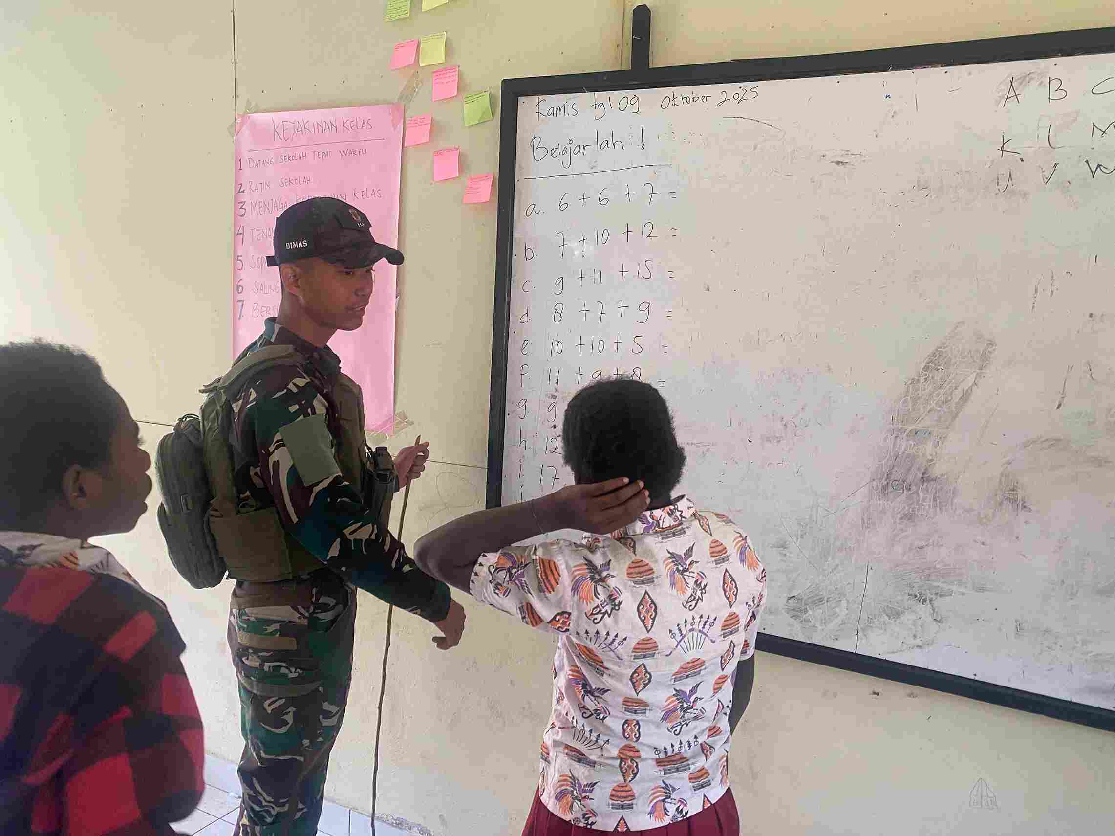 PAPUA TENGAH – Satgas Yonif 112/DJ Pos Tinggi Nambut memberikan Wawasan Kebangsaan dan membagikan Sarana Penggalangan berupa Buku Tulis di Sekolah dasar (SD) Inpres Distrik Tinggi Nambut, Kabupaten Puncak Jaya, Provinsi Papua Tengah, Senin (27/10/2025).
