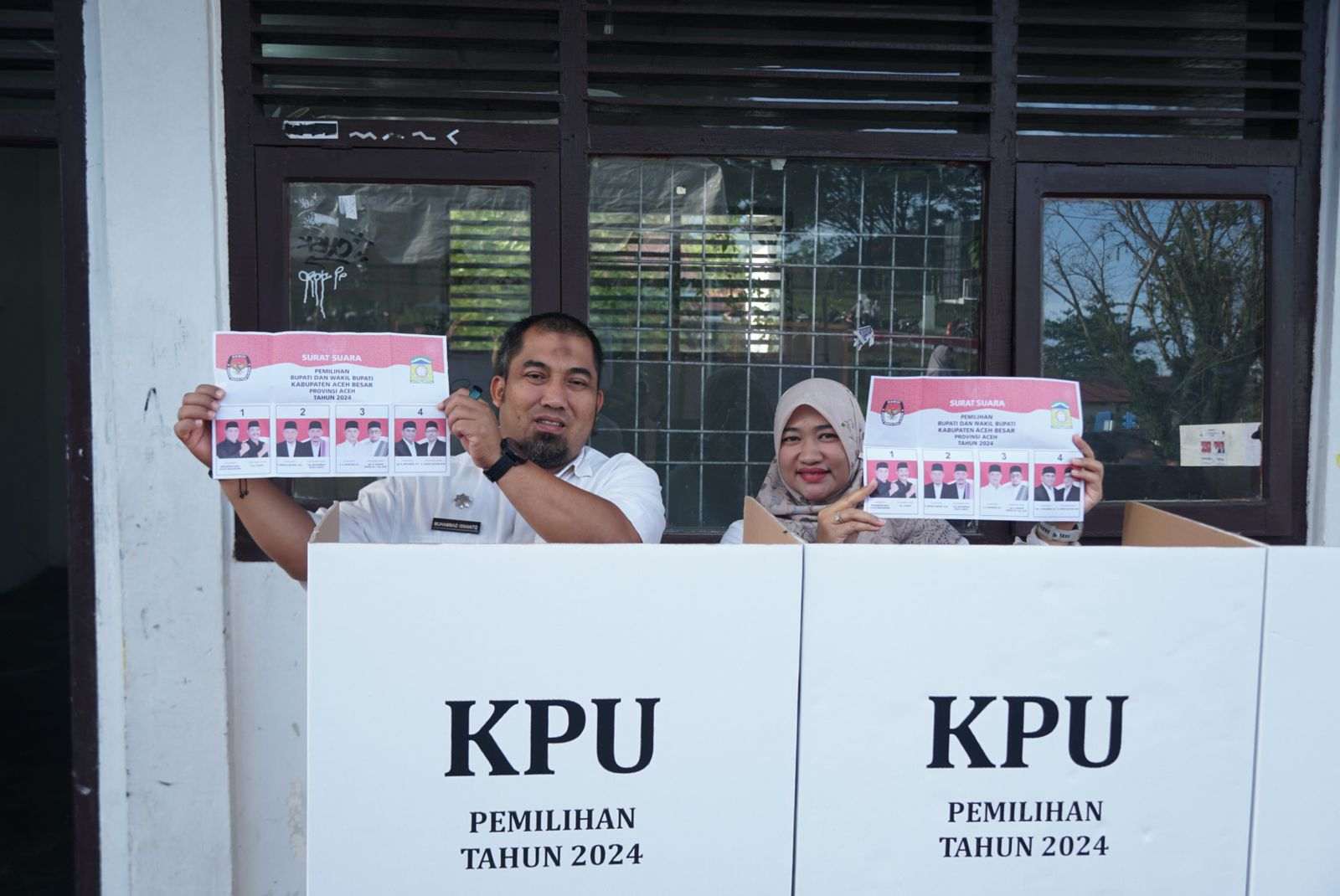 KOTA JANTHO – Penjabat (Pj) Bupati Aceh Besar Muhammad Iswanto SSTP MM bersama isteri yang juga Pj Ketua TP PKK Aceh Besar, Cut Rezky Handayani SIP MM melakukan pencoblosan untuk menyalurkan hak pilihnya pada Pilkada Aceh Besar tahun 2024 di Tempat Pemungutan Suara (TPS) 001, Gampong Jantho Makmur, Kecamatan Kota Jantho, Aceh Besar, Rabu (27/11/2024) pagi.