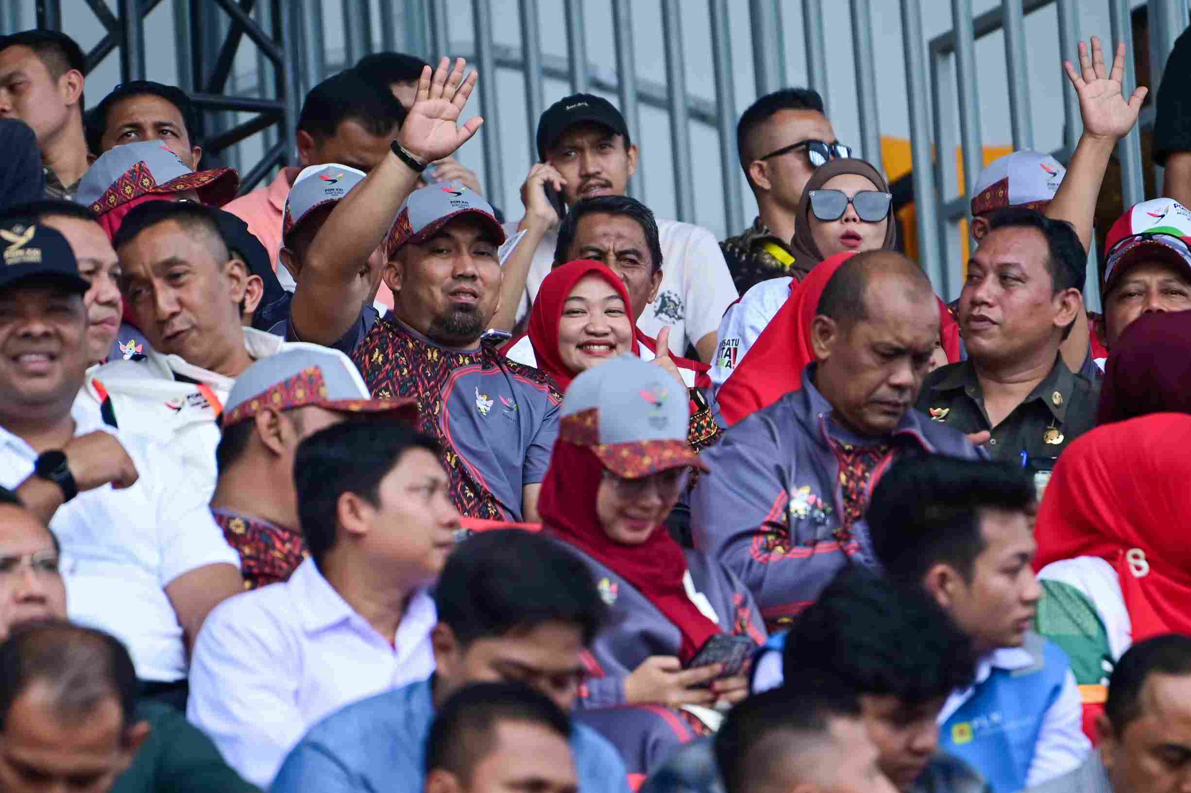 Iswanto dan Cut Rezky terlihat kompak mengenakan jaket PON, Keduanya juga melambaikan tangan saat disapa juru kamera.