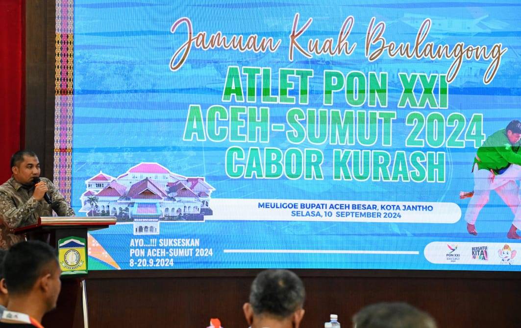 KOTA JANTHO – Penjabat (Pj) Bupati Aceh Besar Muhammad Iswanto S.STP, MM menjamu kuah beulangong untuk atlet Pekan Olahraga Nasional (PON) XXI Aceh-Sumut Cabang Olahraga (Cabor) Kurash di Meuligoe Bupati Aceh Besar, Kota Jantho (10/9/2024) malam.