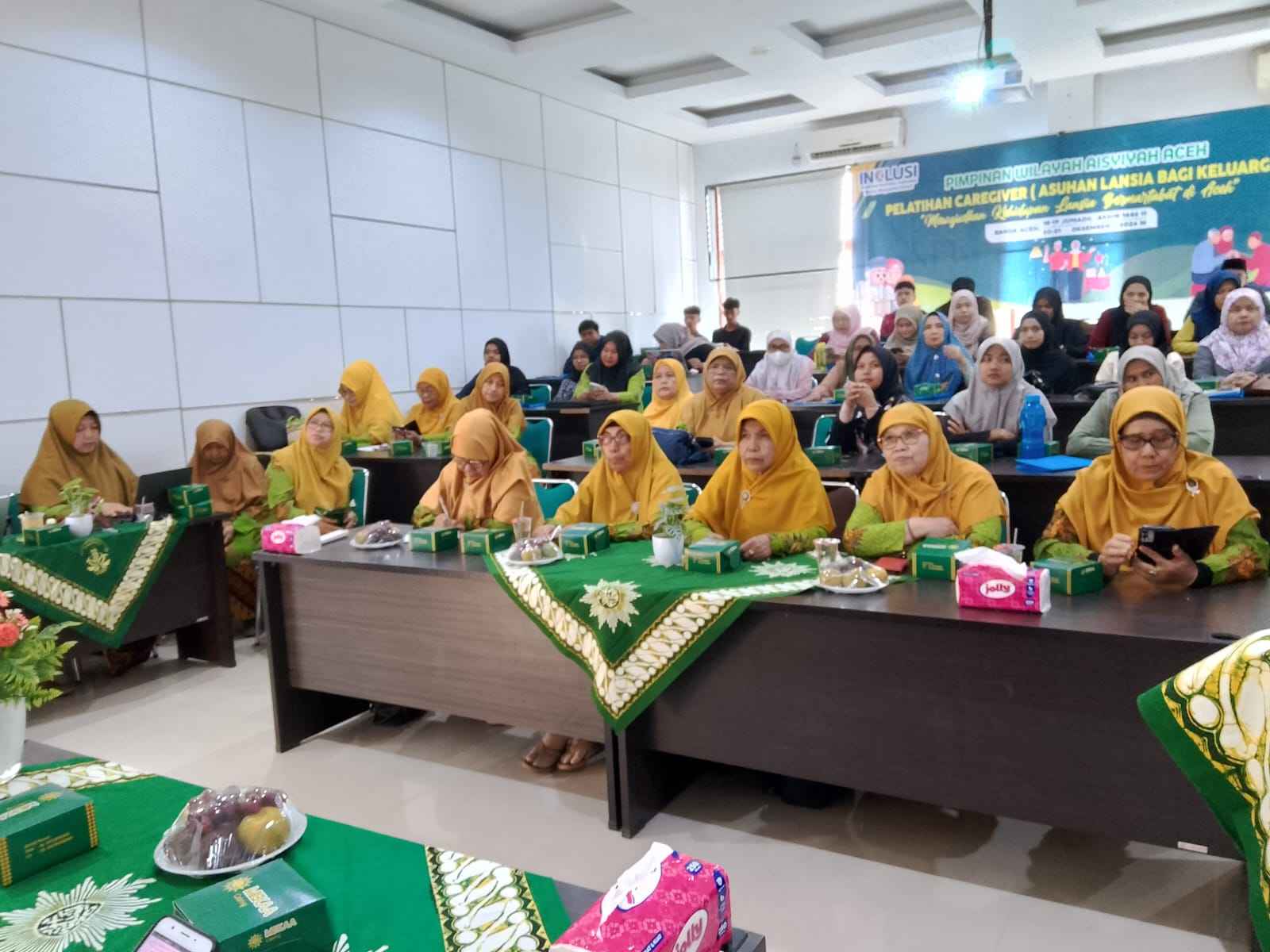 Pelatihan ini dibuka oleh Ketua PWA Aceh Ibu Hj. Ashraf, S.P., M.Si yang diwakili oleh sekretaris PWA Aceh ibu Dra. Sarwati Sofyan. Dalam sambutannya, ia menyampaikan Pelatihan ini bertujuan memberikan pengetahuan dan keterampilan kepada pendamping lansia atau caregiver agar dapat memberikan perawatan yang terbaik kepada lansia untuk memenuhi kebutuhan dasar lansia,