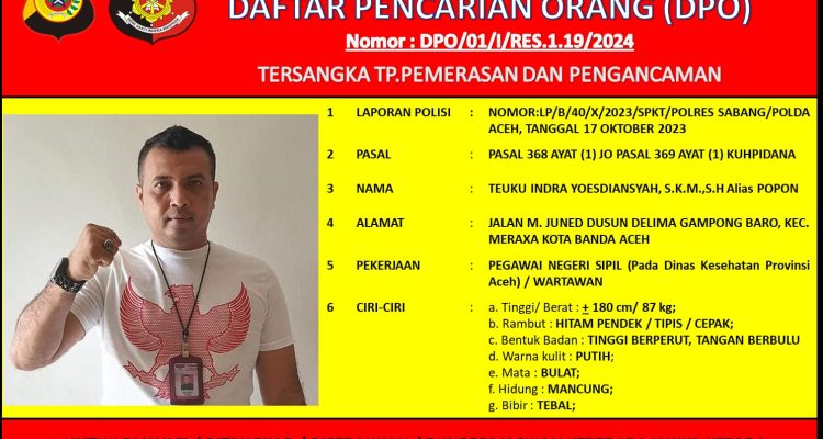 Daerah Seorang Oknum Wartawan di Sabang Ditetapkan sebagai DPO, Ini Kasusnya Daerah, headline|22/01/202422/01/2024oleh redaksi KOTA SABANG – Seorang oknum wartawan di Sabang berinisial TIY alias Popon