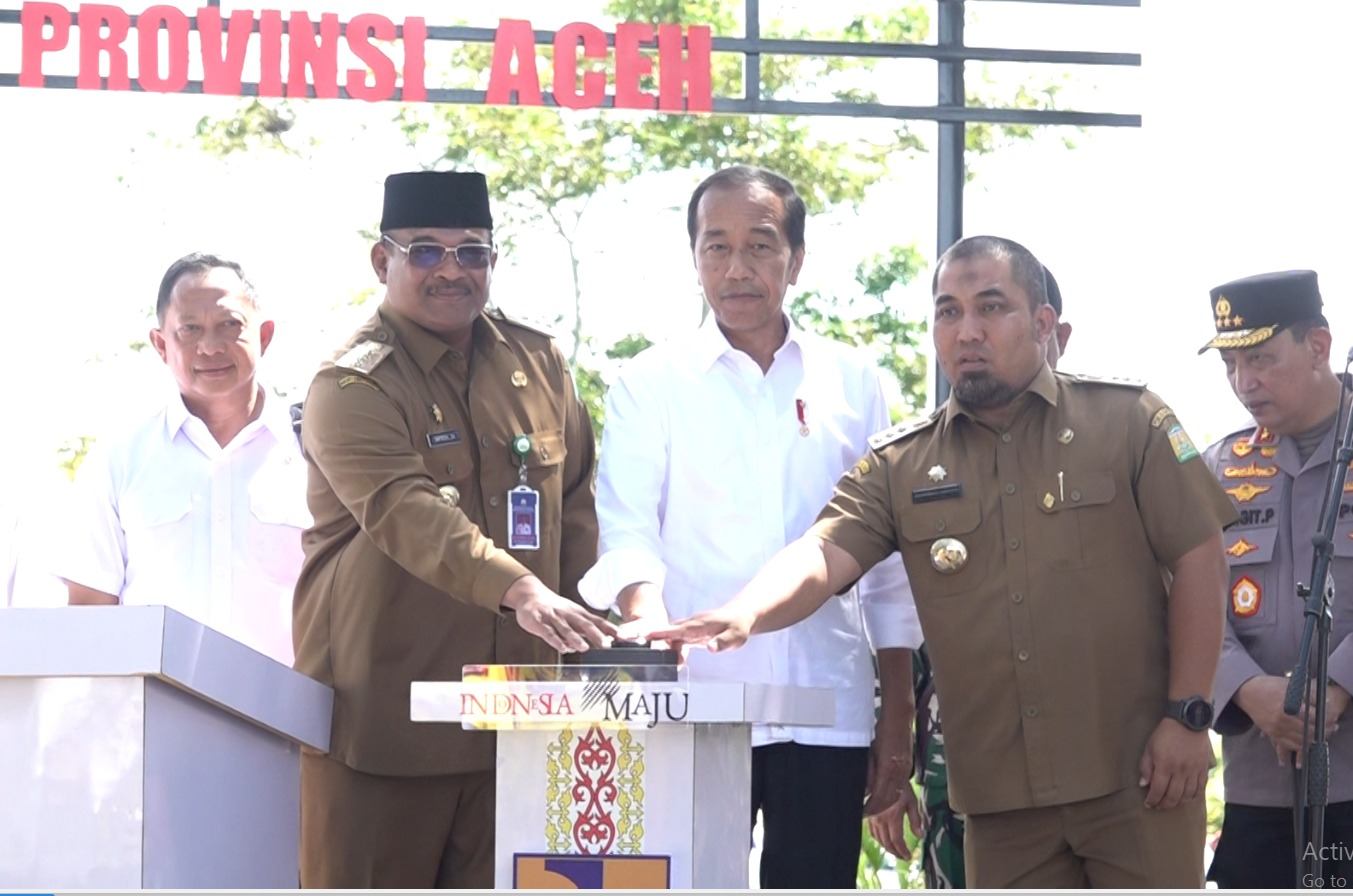 KOTA JANTHO – Presiden Joko Widodo meresmikan Inpres jalan daerah di Aceh, yang ditandai dengan menekan tombol sirene bersama Pj Gubernur Aceh Dr Safrizal ZA, MSi dan Pj Bupati Aceh Besar Muhammad Iswanto SSTP MM, turut mendampingi Panglima TNI Agus Subiyanto, Kapolri Listyo Sigit Prabowo serta menteri Kabinet Indonesia Maju, di Blang Bintang, Aceh Besar, Selasa (15/10/2024).