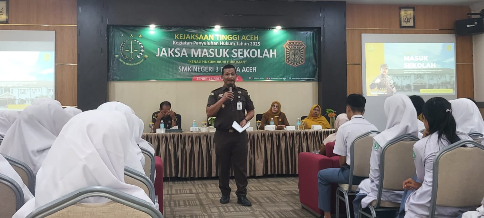 BANDA ACEH – Tim Penyuluhan Hukum Kejaksaan Tinggi (Kejati) Aceh mengunjungi SMK Negeri 3 Banda Aceh dalam rangka pelaksanaan program edukasi hukum melalui kegiatan Jaksa Masuk Sekolah (JMS) pada Senin (24/2/2025).