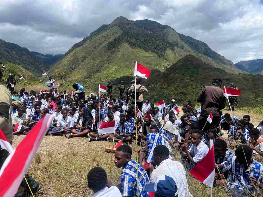 PAPUA TENGAH – Ditengah semangat warga dalam menyambut Hari Kemerdekaan Republik Indonesia yang ke 80 tahun, Satgas Yonif 112/DJ beserta aparat keamanan setempat serta siswa/siswi dan masyarakat yang ada di Distrik Ilu melaksanakan pengibaran Bendera Merah Putih di Bukit Natal Distrik Ilu, Kabupaten Puncak Jaya, Provinsi Papua Tengah, Sabtu. (16/08/2025).